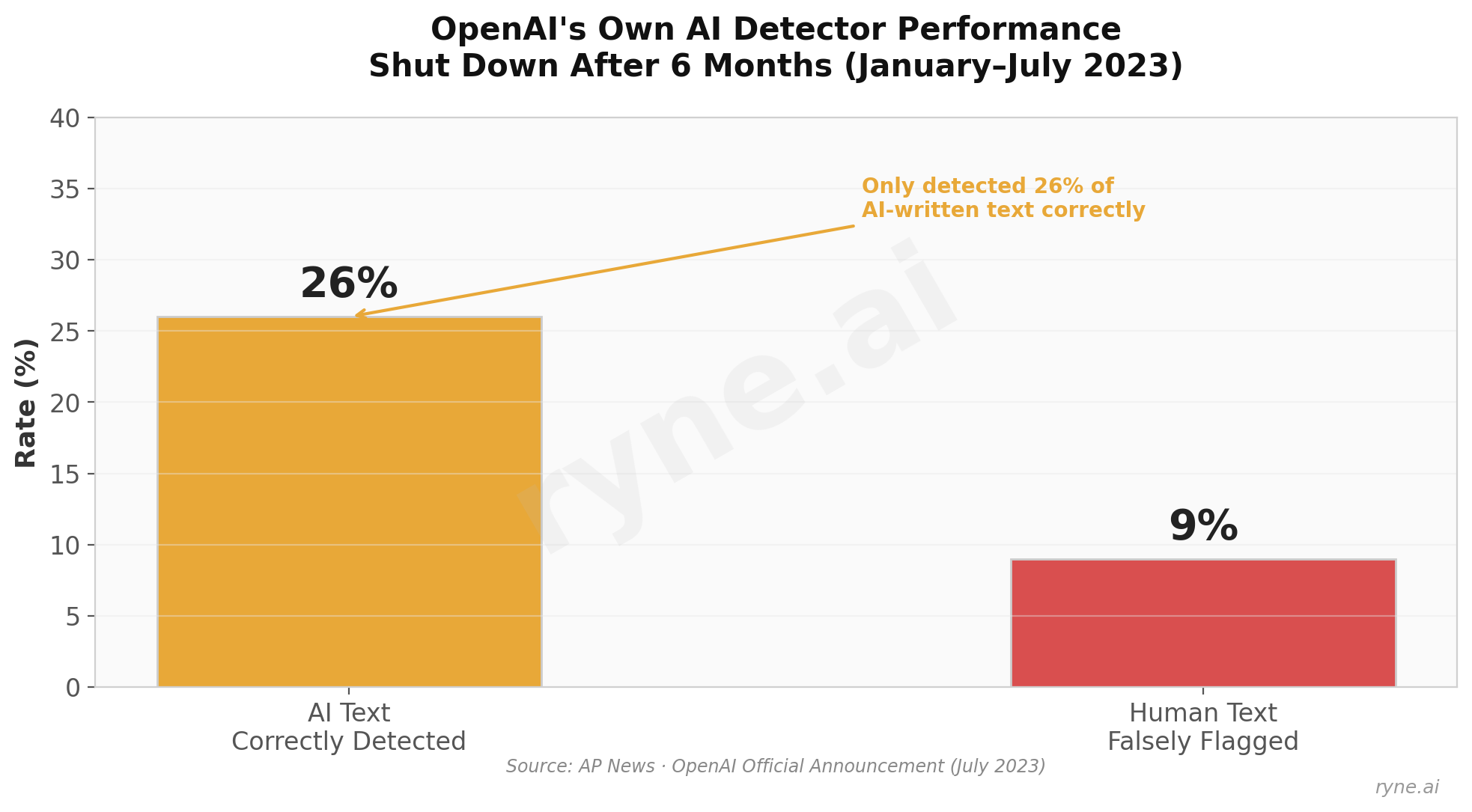 According to AP News, their classifier correctly identified AI-written text only 26% of the time — worse than a coin flip — while falsely flagging human writing 9% of the time.