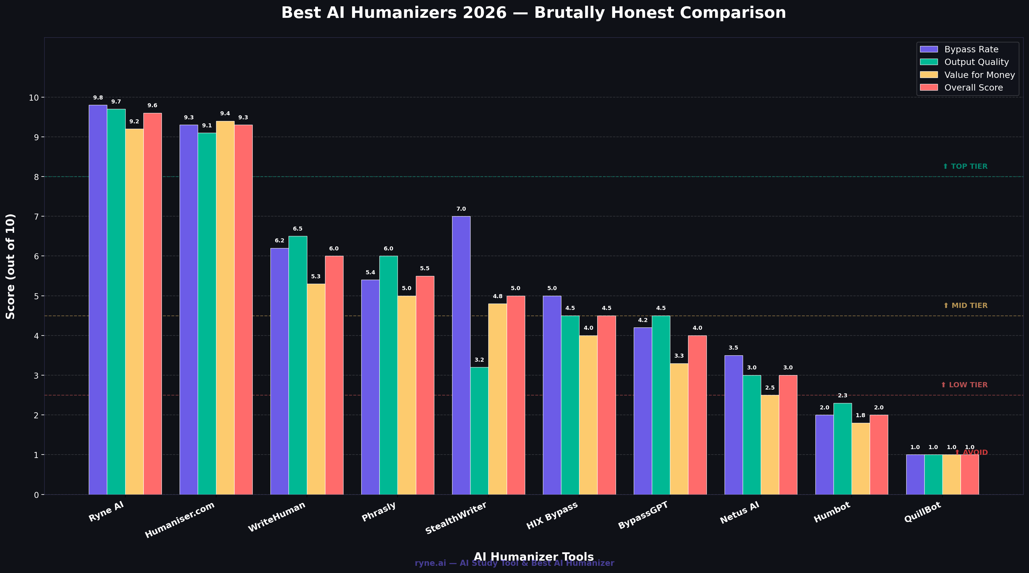 best-ai-humanizers-comparison-chart.png | Alt: Bar chart comparing the 10 best AI humanizers in 2026 across bypass rate, output quality, value for money, and overall score