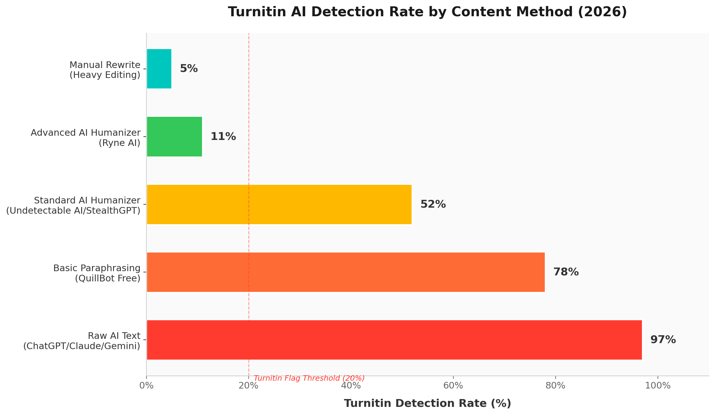 Can Turnitin detect humanized AI — bar chart showing detection rates for raw AI text (97%), basic paraphrasing (78%), standard humanizer tools (52%), advanced AI humanizer / Ryne AI (11%), and manual rewrite (5%) in 2026